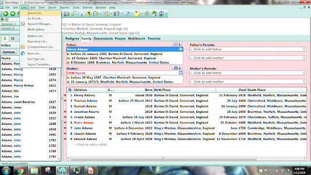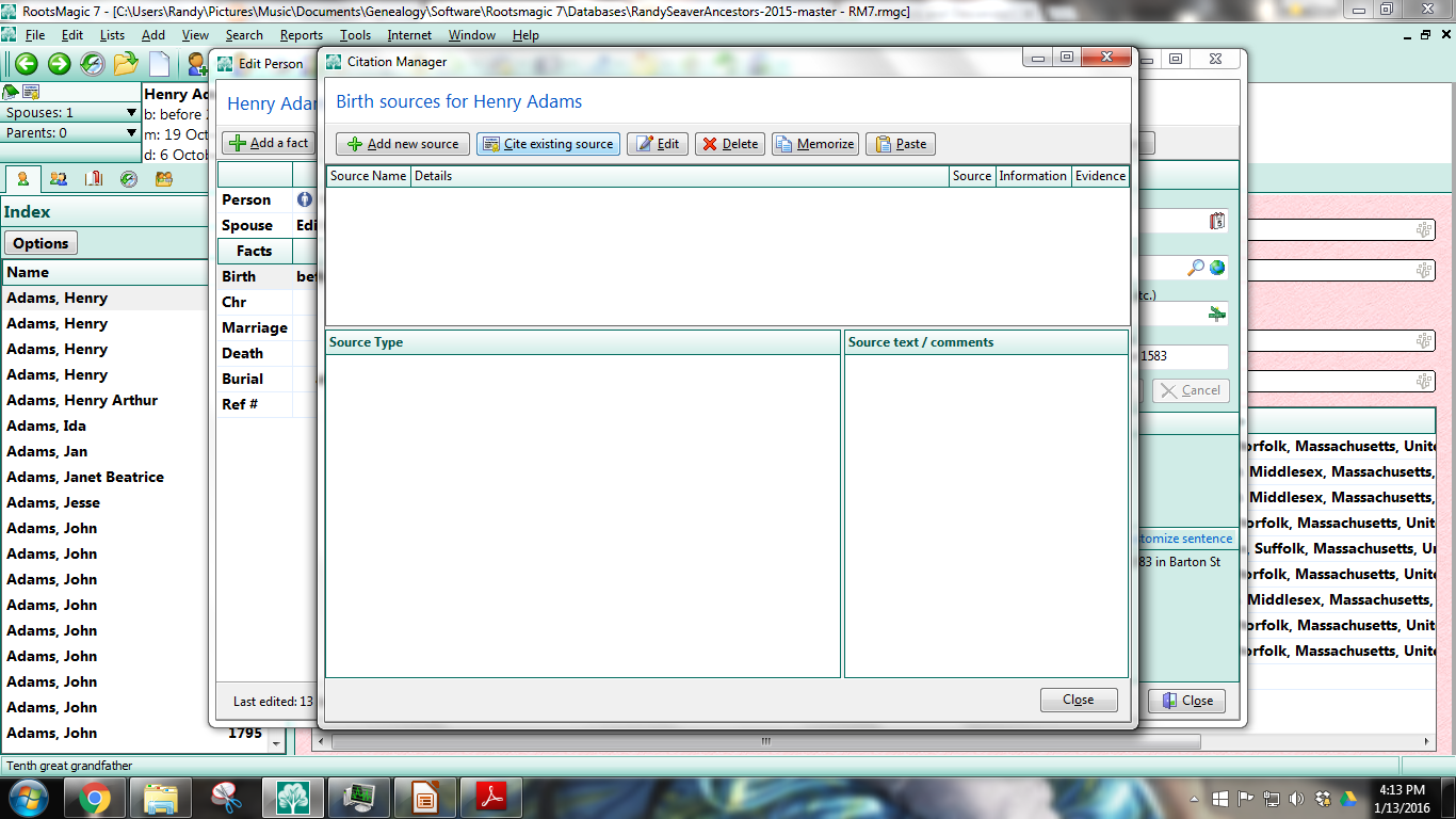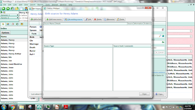 1) In the "Edit Person" screen for Henry Adams (1583-1646), I see that I have a baptism date and estimated birth date for Henry Adams, but have no source citation: