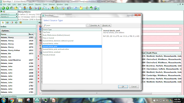 4) I picked the "Adams of Braintree - by Fairbanks (NEHGR v59)" master source, and clicked on the "Select" button (at the bottom right of the screen), and saw: