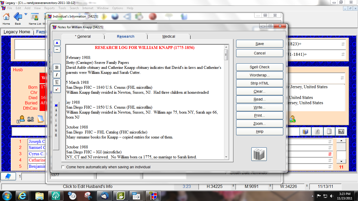 1) RootsMagic 4 does not have a "Research Notes" or "Research Log" function, at least one that's easily found. The user could add Research Log information to the Person "Notes" field, but they may not want to do that. Because my Brick Wall problem is the parents of William Knapp, I created a "Father" for William Knapp named "Knapp" and copy/pasted my Research Log text into the Notes for that Person: