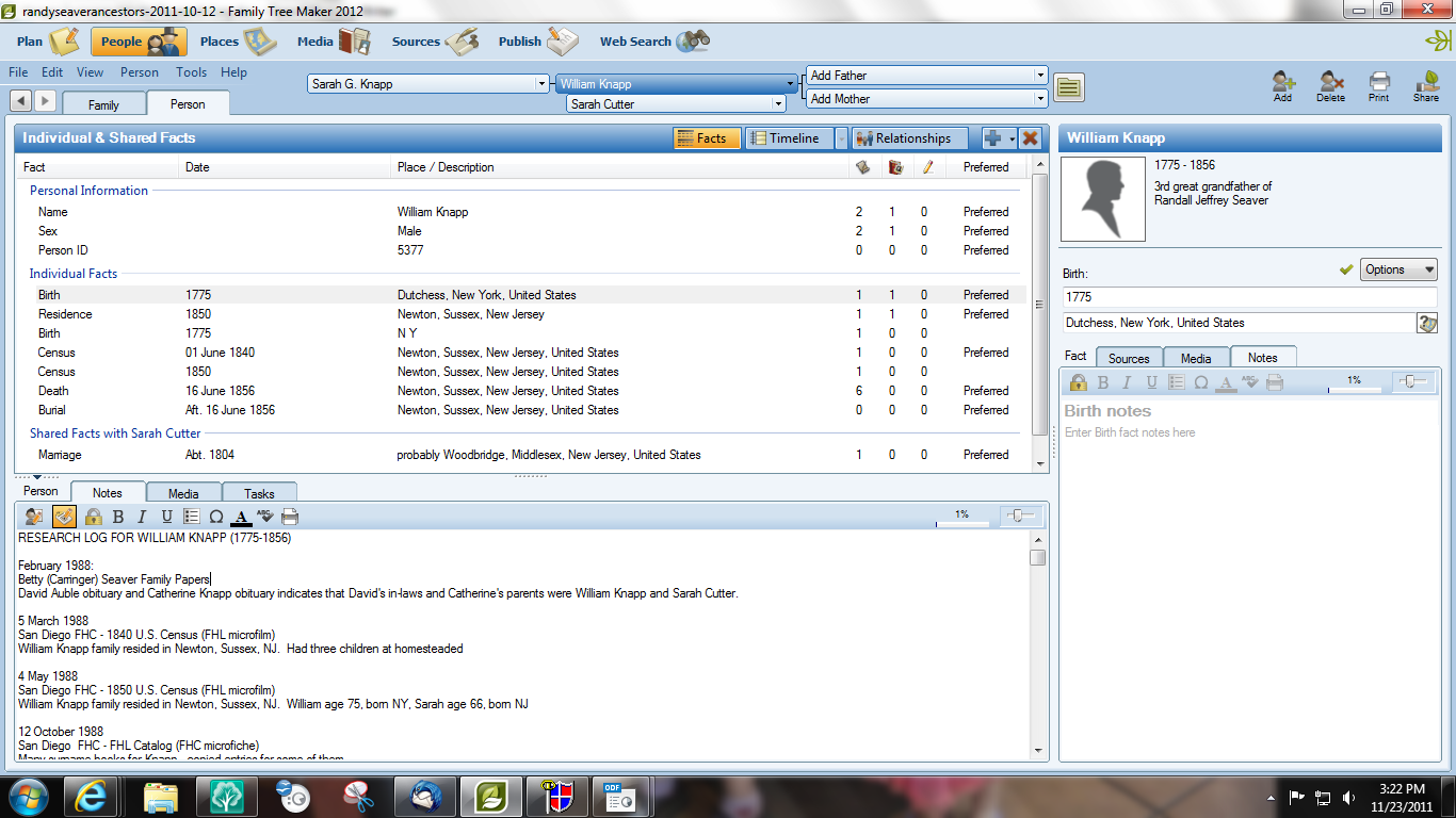 * I created the Research Log for the entire surname, not just for William Knapp. Not all of the information in the Log is for William Knapp - most of it is my attempt to find information about his unknown parents. Should I have put the Research Log into William Knapp's "Research Notes" tabs in the software?